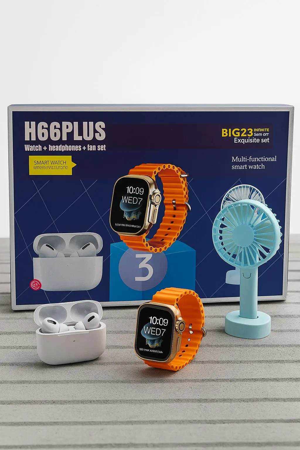 El H66 Plus es un combo tecnológico súper completo que combina smartwatch, auriculares inalámbricos y mini ventilador portátil. Ideal para regalar, usar todos los días o crear promociones irresistibles en tu tienda.