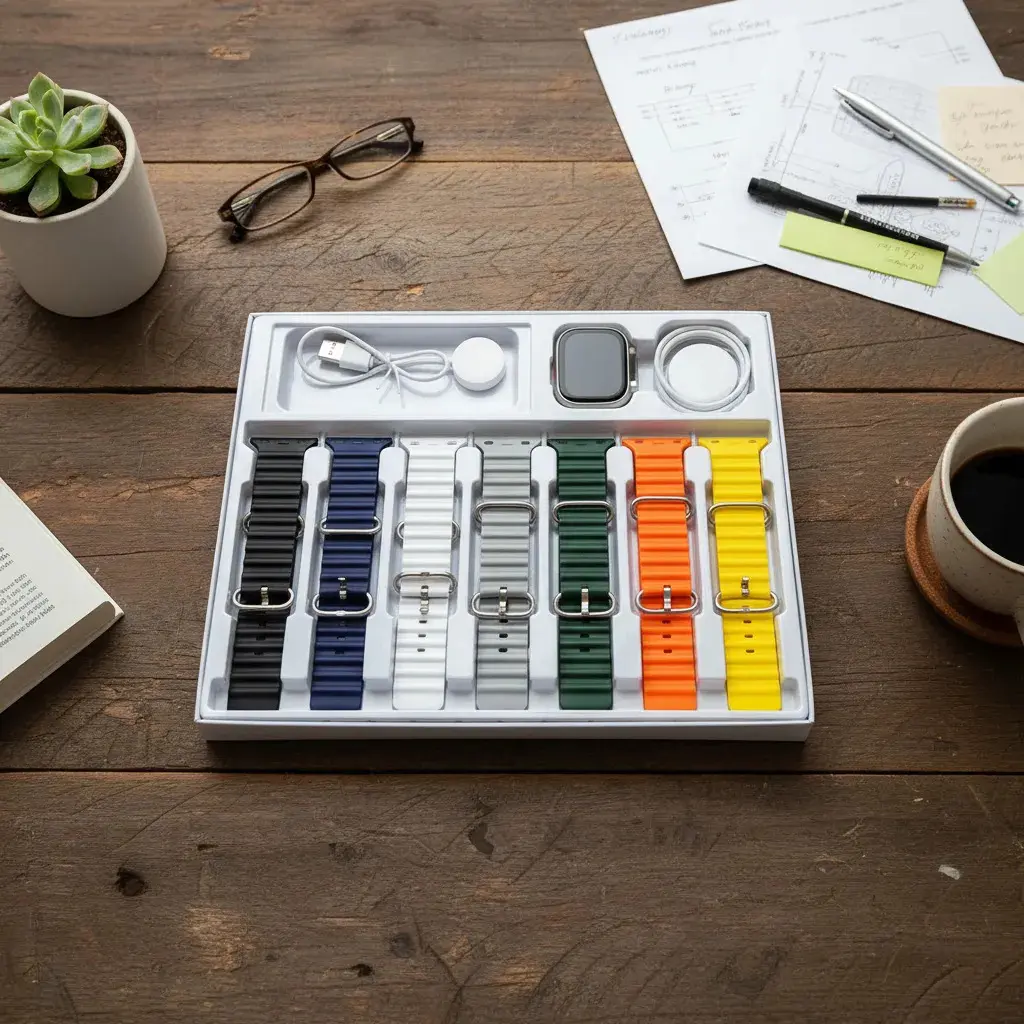 7 correas extra (negra, blanca, azul, amarilla, verde, gris y otra blanca adicional)