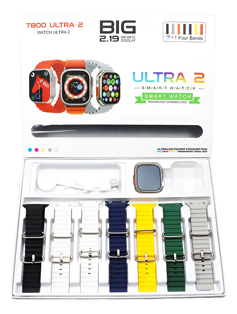 El T800 Ultra 2 es el smartwatch que está arrasando en ventas por su diseño moderno, su pantalla grande de 2.19 pulgadas y su increíble pack de 7 correas adicionales, que te permite cambiar de estilo todos los días.
